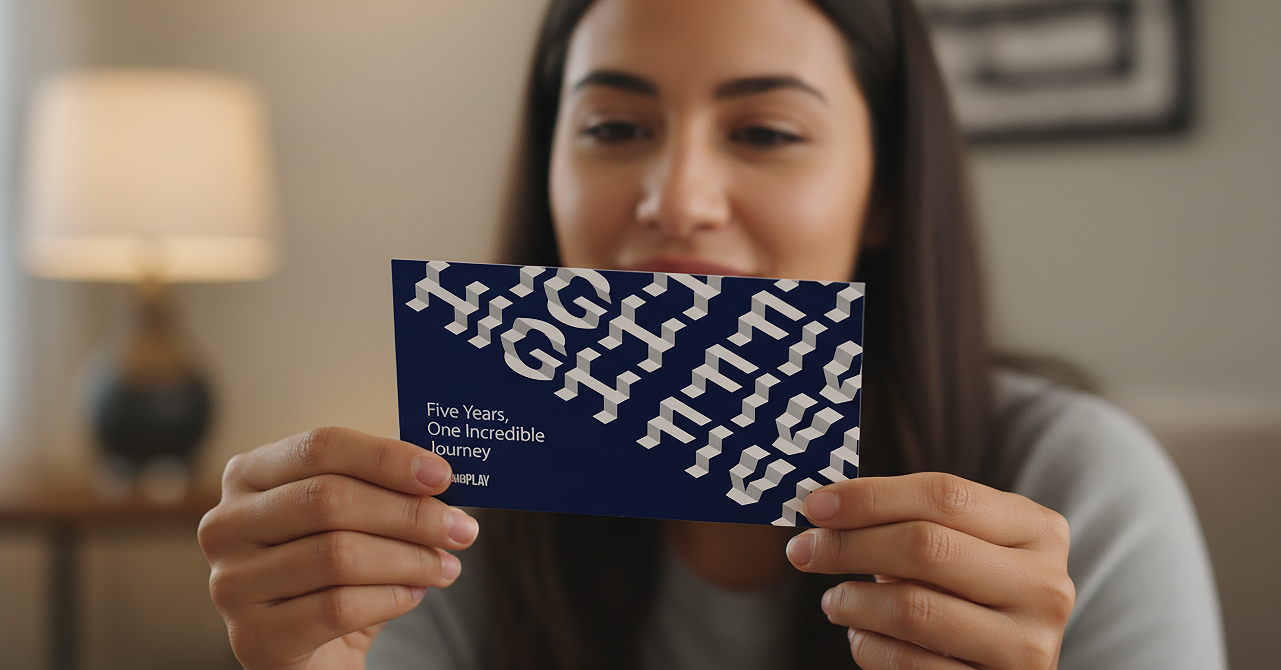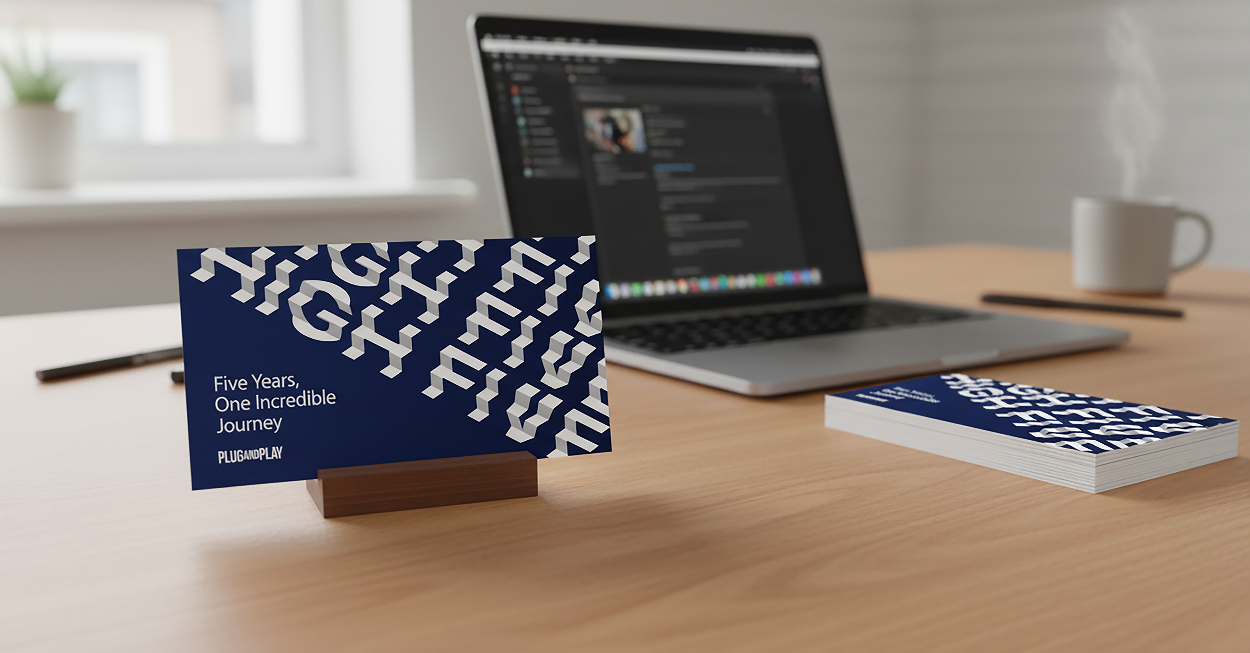 This anniversary card was designed for Plug and Play employees who celebrated five-year milestones, using stair-step typography to form a high five. The design celebrates teamwork, growth, and achievement, while the step layout guides the viewer’s eye upward in a playful, dynamic way. Dark blue was used for the background to provide contrast, while crisp white typography highlights the stair-step pattern, making the visual both striking and easy to read. This project demonstrates creative typographic exploration, thoughtful color choices, and a focus on engaging, celebratory design for employees.